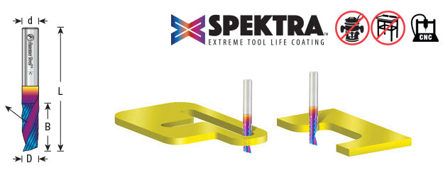 Our Spektra bits feature a nACo nanocomposite coating with an extreme nanohardness and heat resistance. With a brilliant distinctively-tinted coloring nACo provides additional improvements in four critical aspects of router tooling.