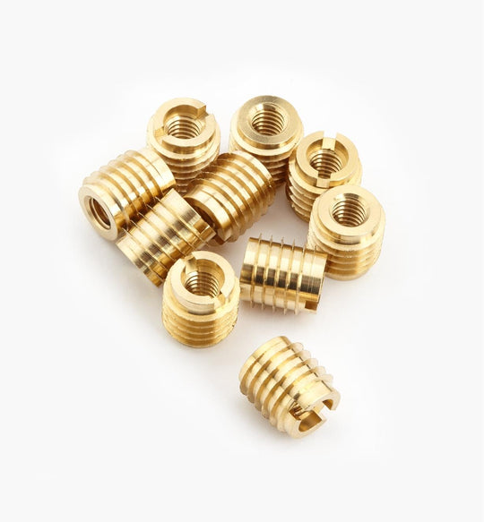 Machine screws and threaded inserts are ideal for projects where you want brass hardware, but still want knock-down convenience.With knife-edge external threads for a secure hold, the 5/16-18 insert nuts require a 1/2" pre-drilled hole. Supplied in a pack of 10.