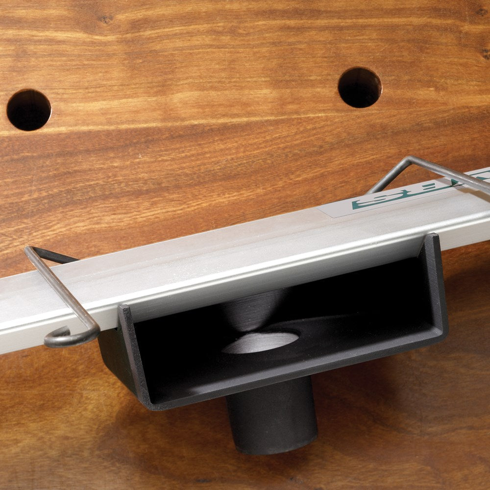 A Must-Have for Your Jig The process if routing dovetails on a Leigh jig creates a lot of fine saw dust, and quite quickly. The Vacuum and Router Support(VRS) helps to collect this as it is created. In addition to this, the Support part of the VRS gives the router support before, during and after the cutting process. On top of the VRS are the adjustable control arms, the router sits between these arms moving the dust chute with the router. This means the duct chute is always where the cutting is being done, providing the most effective dust extraction possible. The VRS has an adaptor to accept hose sizes of either 1” of 2-1/2”, common to most vacuum systems. This accessory kit combines the VRS and a set of router bits at a great KIT price. LGH-VRS12 and LGH-16078 bit set make up the LGH-AC12 for the Leigh Super 12 jig