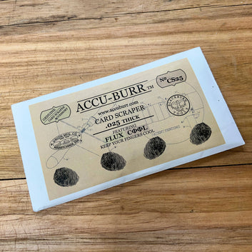 If you're going to offer the World's Best burnishing device, you should really pair it with a quality Card Scraper!Card scrapers are often referred to as 'Cabinet Scrapers' and are thankfully seeing a return to favour amongst woodworkers. These simple tools are incredibly effective and useful for a variety of tasks in your shop and can even replace sandpaper to finish your project! Union Manufacturing Co. offer this premium quality blue-tempered 1095 spring steel card scraper, hardened to 48-51 Rockwell, complete with a Flux-Cϕϕl Magnetic finger saver. This tool will hold an edge well but is easy to sharpen, especially when combined with the Accu-Burr™ Carbide Burnishing tool which makes quick work of turning an edge burr.But what is a Flux-Cϕϕl Magnetic finger saver? Well, as anyone who has used a cabinet scraper knows, the friction in use can cause the tool to heat up quite quickly and get uncomfortably hot under finger or thumb. The Flux-Cϕϕl is simply a thick magnet that you can place on the scraper where your fingers or thumbs rest. It is flexible enough not to impede flexing for use, but is remarkably effective at dispersing heat build up, enabling longer scraping sessions, more comfortably. A delightfully simple solution!The Accu-Burr™ Scraper is 152 x 63 x 0.63 mm (6" x 2-1/2" x 0.025") and sold individually, including a single Accu-Burr Flux-Cϕϕl magnet.