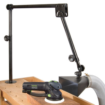 Collect dust from nearly anywhere with our adjustable dust arm. Often when doing woodworking that is creating saw dust, it is not always possible to have someone hold a dust extractor hose at the source, or even do it yourself. So Carbatec's Adjustable Dust Arm is the answer. Attach it to a table or mount it to the wall. Its arm extends 1. 12 m vertically and 1. 52 m horizontally. Its pivoting and locking mechanism allows the arm great mobility and flexibility for easy positioning. The plastic hood has an opening of 100 mm x 254 mm and accepts standard 4" hose. Hose, dust extractor and sander are not included.