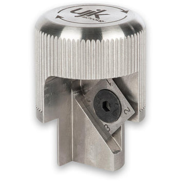 The UJK Parf Chamfer Tool features a solid tungsten carbide cutter with four cutting edges, which can be rotated 90° when they become dull. Only suitable for use with MDF or ply with a melamine facing.