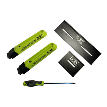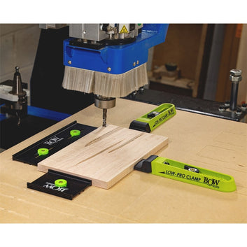 Bow Products has now released one of the most versatile low profile clamping kits for use on CNCs, t-track tables, dog tables, wooden workbenches or simply any wooden surface. The BOW-LCP1 features four interchangeable clamp tips that provide a range of clamping options, two clamps, two fences and all the required hardware you need for proper securement.