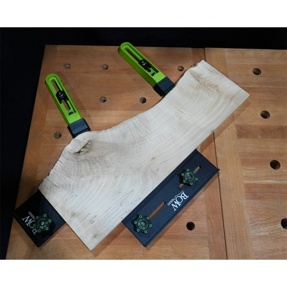 The strong downward clamping pressure offers unobstructed access to work surfaces and edges while securely holding your material down. The clamps have a full 360 deg rotation and 4 linear positioning range. Your new Bow Products Low Profile Clamping Kit also includes the new patented expandable dogs, these are designed to expand symmetrically from top to bottom as compressed. The expandable dogs fit 3/4" diameter holes and grips in holes 1/4" and deeper.Imperial version only.