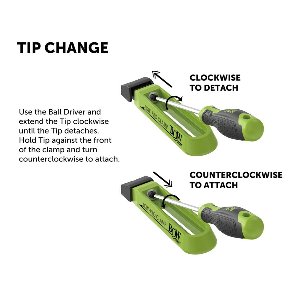 Never be inconvenienced by dull or damaged EVA tips! Designed to suit the Bow Products Low Profile Clamps, this pack of six replacement tips should be an essential in any home or workshop. Your EVA tips are reversable, nonmarring and will conform to your workpiece. They are ideal for soft woods, corners, rounds and hold downs. To change the tip simply use the ball driver screwdriver that comes with the BOW-LCP1 and extend the tip clockwise until it detaches. To reattach, hold the tip against the front of the clamp and turn counterclockwise.