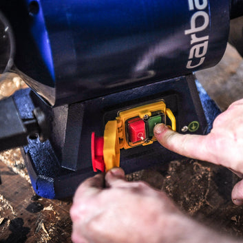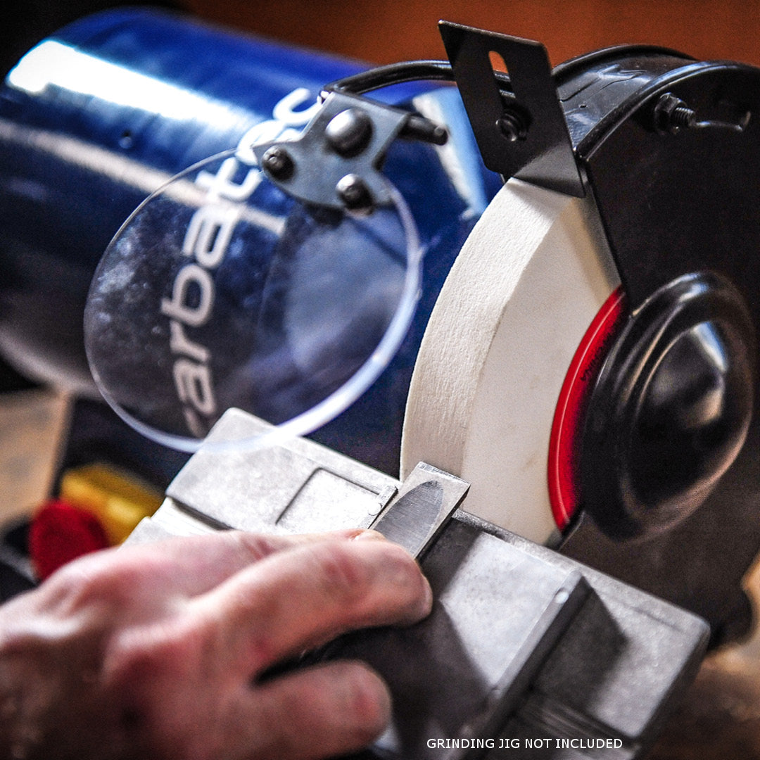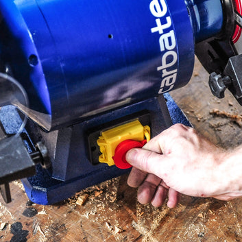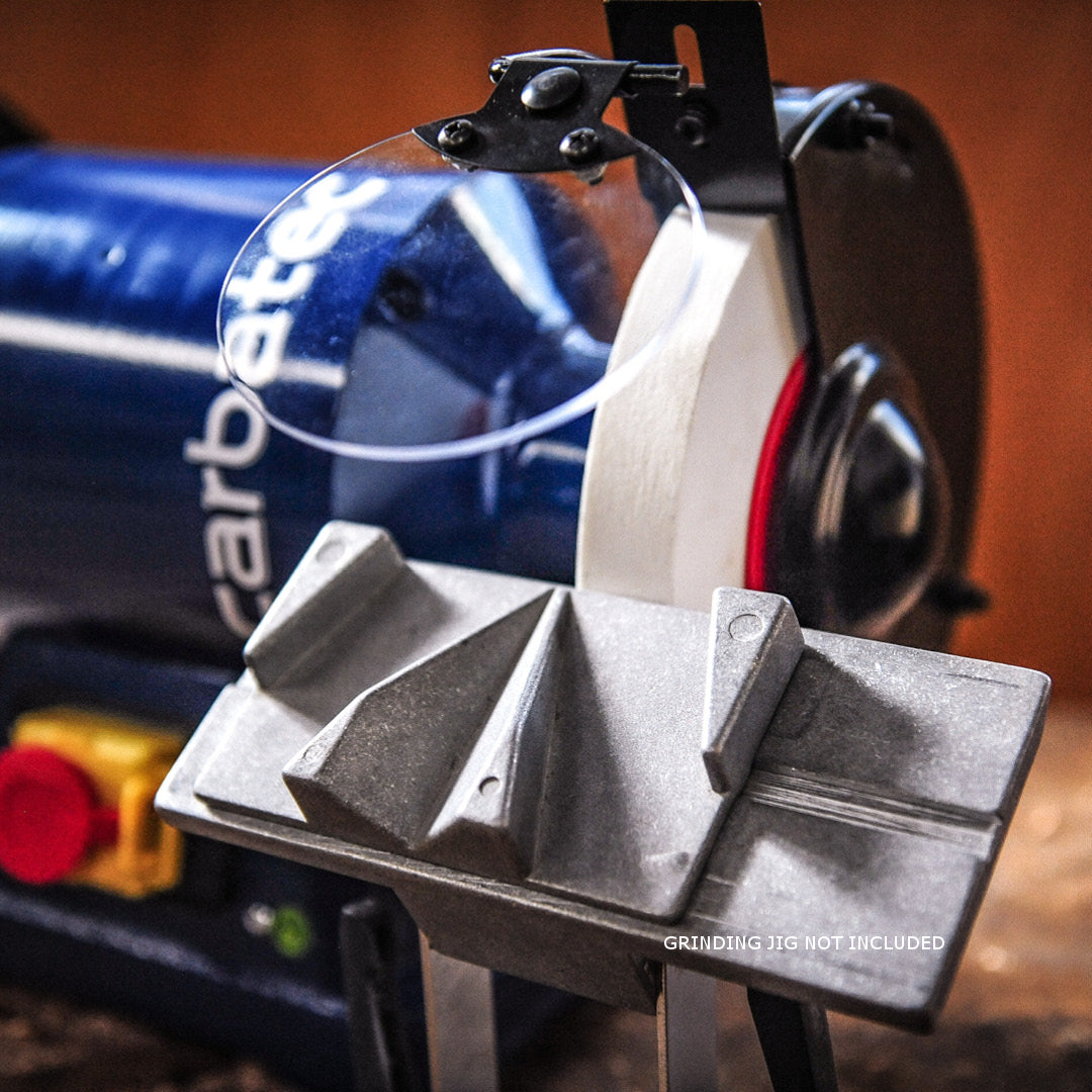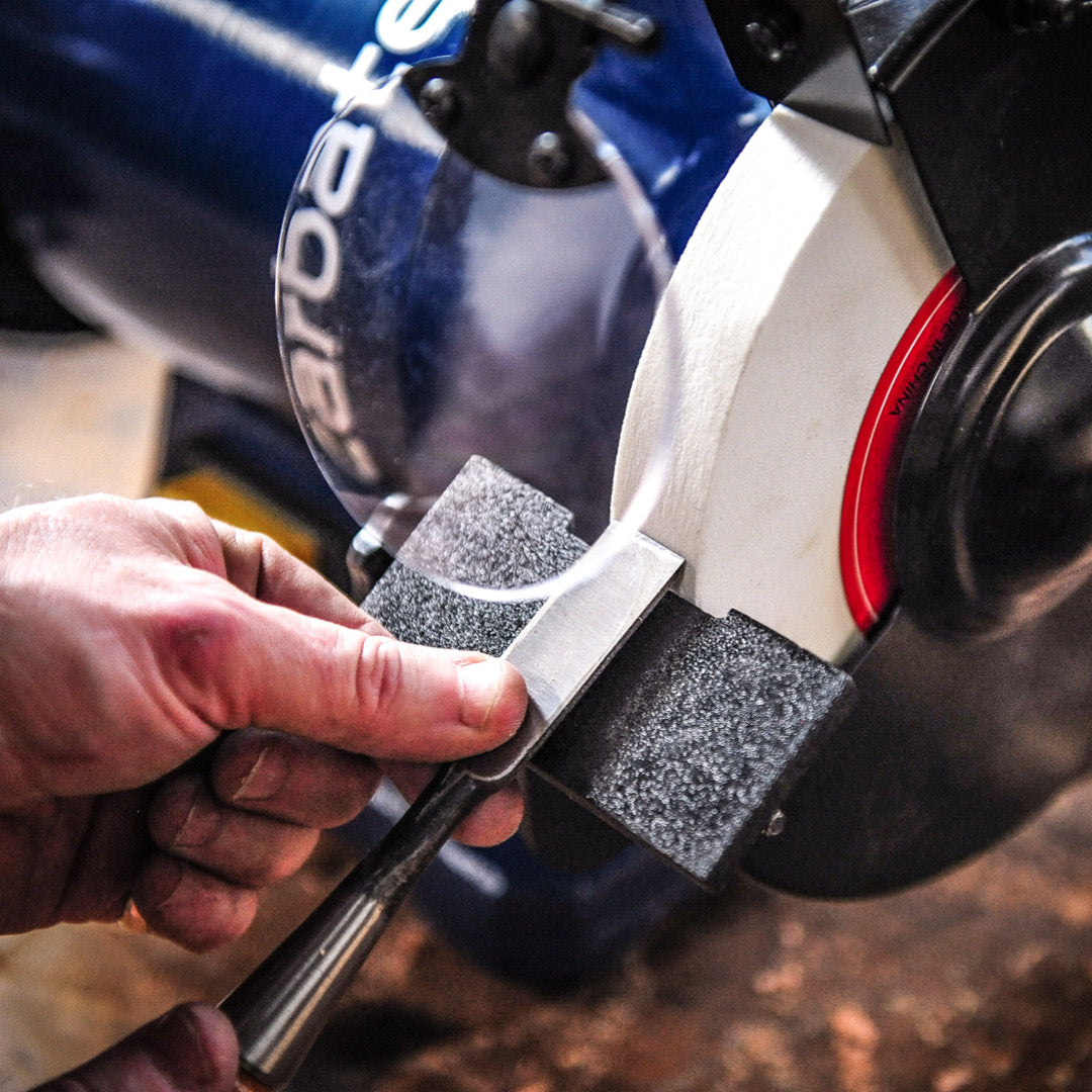 As your tool and machine collection grow, so does the need for maintenance. This low speed grinder has been developed to help you to keep your tools sharp and ready to use. Most standard bench grinders run at more than 2,800RPM, and with extra speed, comes extra heat. Heat build-up while grinding destroys the temper of your tool steel. The Carbatec Low Speed Grinder runs at only 1,450RPM, meaning less heat and less temper degradation (blueing). LOWER SPEED = MORE TORQUE! The 2x large 8" (200 mm) wheels offer minimal hollow grind and are both Aluminium Oxide made specifically for HSS and other tool steel. Standard 'grey' wheels are for general grinding, not sharpening. We supply an 80G & 120G wheel, so you can easily reshape and sharpen your tools, ready to use, without having to change wheels. We have done away with the small magnifier guards found on most grinders, in favour of a large, clear guards, with sturdy steel wire supports. These will give you a more accurate visual reference, but also a longer life. Flat & robust tool rests are included, and with a host of accessories available, you can easily build a powerful sharpening station around this unit.