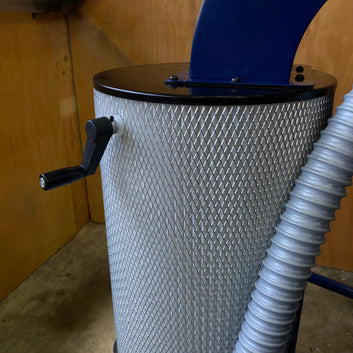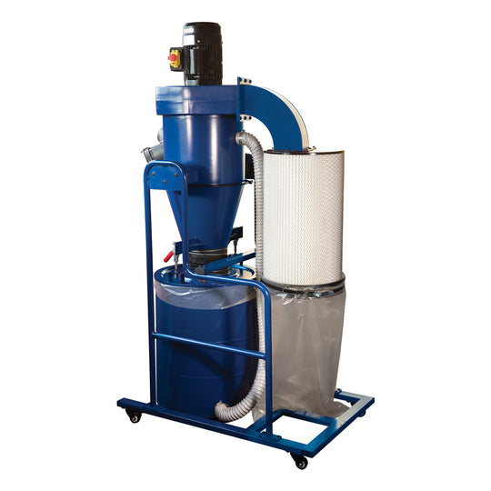 Carbatec CDC-650P 2-stage Cyclone Dust Collector The perfect replacement for your traditional 2HP bagged dust collector, with a compact base area, and superior performance. Two 100 mm (4") outlets or a single 125 mm (5") outlet, and all the efficiency you get from a well engineered two stage cyclonic separator. We have also included the unique choice of a bag, or bagless collection system. Reusable plastic bags in your collection drum are quick and convenient for waste disposal, but do become waste themselves at some point in the future. Mindful of your impact on our planet, we have designed our cyclone collector to run with or without these collection bags. Simply remove the integrated bag retention system and utilise the mobile drum itself as your collector. A cyclone dust collector works very differently to a traditional bagged type collector; A cyclone has separate impeller housing, attached to the top of a cone-shaped funnel. The sole purpose of the impeller is to create a high volume air flow, which is drawn through the cone, creating a higher pressure vortex (or cyclone) of incoming air. This fast spinning air within the funnel separates the heavier wood chips and large dust particles from the fine dust, causing them to drop into the collection drum below (Stage 1). The very fine dust, and the clean air, pass through or are collected by a very fine, pleated cartridge filter (Stage 2). This two-stage process of separating the material reduces the rate at which the filter will clog up. This reduced clogging allows more air through the collector system. Our standard cyclones are highly efficient at removing dust particles down as fine as 1 micron. Another advantage in this design is that the wood chips dont come into contact with the impeller (which would normally disrupt the airflow, dropping efficiency). This means that cyclones are often rated at lower CFMs (compared to traditional collectors), but the actual airflow and pressure in the dust network is kept running at its maximum for much longer. INTENDED USE:This dust collector is only intended for collecting wood dust and chips from woodworking machines. Do not use this dust collector to collect metal, dirt, pebbles, drywall, asbestos, lead paint, silica, liquids, aerosols, or any flammable, combustible, or hazardous materials. *Note: The diameter of the hose and complexity of your dust network can directly influence the performance of your dust collection system; Hoses that are too small in diameter, or too abruptly reduced from a large diameter, can result in poor air flow and potential blockages. Flexible hoses that are run over long distances will also result in poor air flow and dust can build up in the hoses. Changing hose sizes and lengths (increase or decrease) affects system air flow and static pressure in different ways. Changing corrugated or flexible hose, to smooth rigid ducting will have a positive effect on airflow efficiency. Consider one or all of these improvements: Shortening and limiting the runs of flexible hose (in favour of rigid ducting) can reduce your loss in air flow. Alter the layout of your workshop, so the heavy waste producers are closer to your collector. Step down your hose diameters gradually, and further away from the collector. This keeps a good balance between air flow and pressure. Avoid increasing hose diameters, as air flow, and pressure are both reduced.