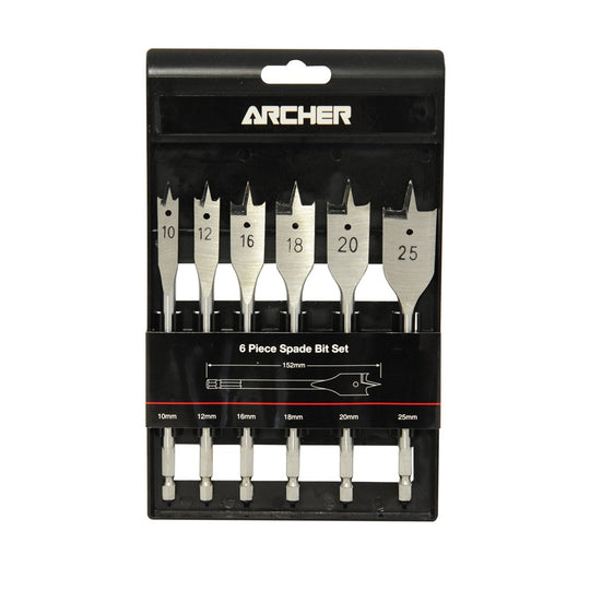 The Archer 6 Piece Spade Bit Set is a "must have" for all woodworkers, and tradesmen alike. It has common sizes included, with all having self centering tips to ensure accurate drilling every time. The 1/4" hex drive will fit most popular drive systems, for a positive secure fit for use. Includes handy carry case.