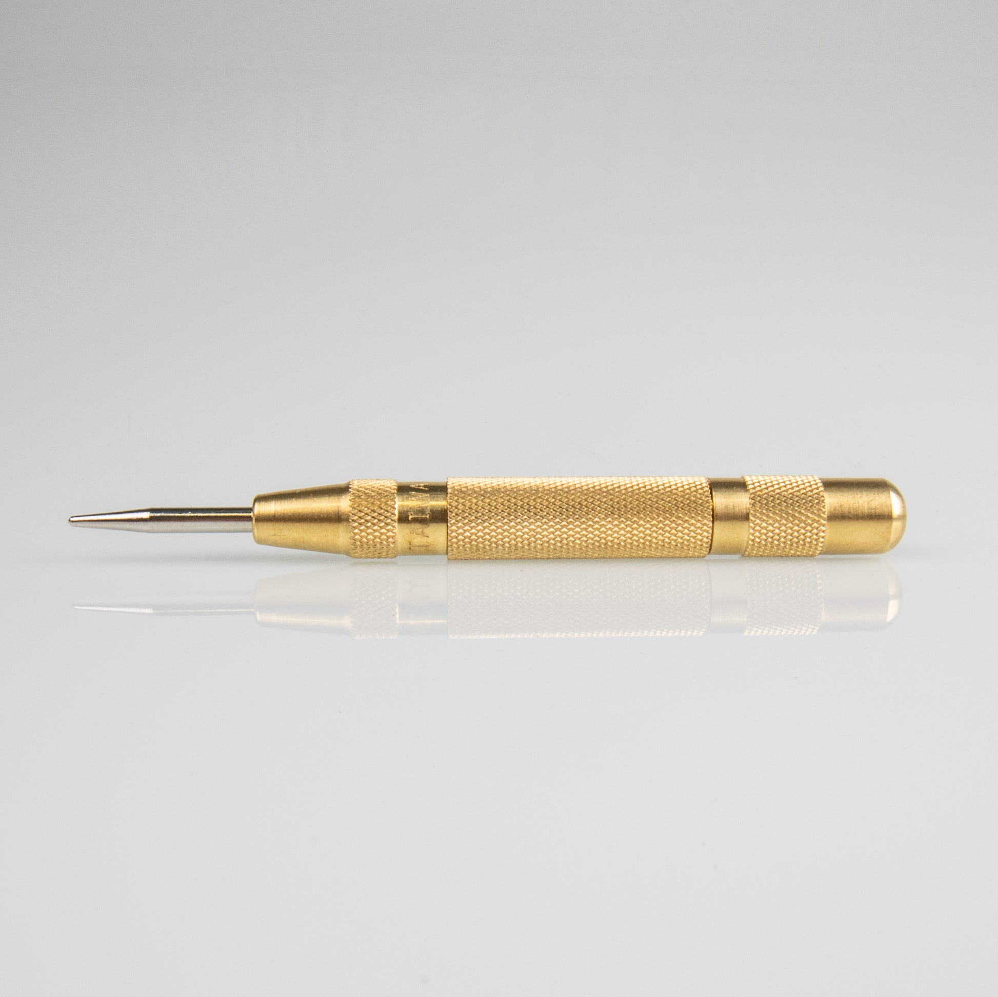 Spring-loaded handle25 mm long hardened steel point89 mm long knurled brass handle