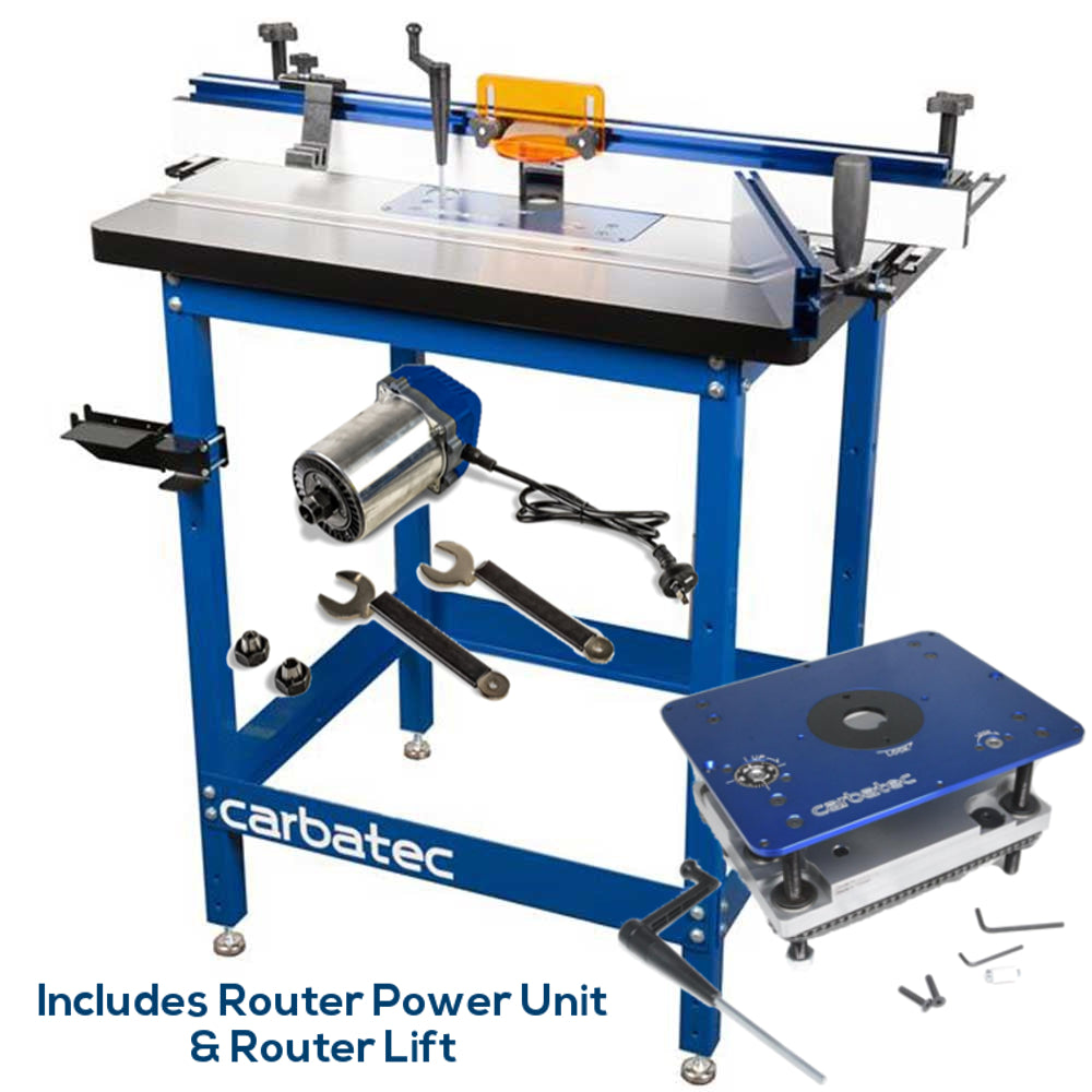 Accept no other and treat yourself to serious cast iron portability. Complete in almost every way, this fully powered kit includes the Carbatec RT-RPU2,400 2,400W Router Power Unit and our dedicated, easy mount fixed base Lift 'n' Lock router lift. Precision ground solid cast iron, milled T Track and pre milled, drilled and tapped to fit the Pro Router Stand. The Pro Router Table Fence is manufactured from a single piece of aluminium extrusion and includes a 63 mm dust port for efficient extraction from above the table, Micro adjusters and a flipstop. Also includes a remote mount NVR (No Volt Release), ON/OFF switch for your router. The top and front feature T slots which allow the fitting of other jigs and accessories including the included transparent guard. The fence assembly also includes adjustable side scales for setting fence alignment and handy planing spacer bars for accurate edge trimming. The Carbatec Pro Stand features box section legs and bolted construction making it solid and stable. There is provision for storage of the included mitre gauge assembly. A five piece set of router table inserts are available, with the standard insert having a 38 mm inside diameter.
