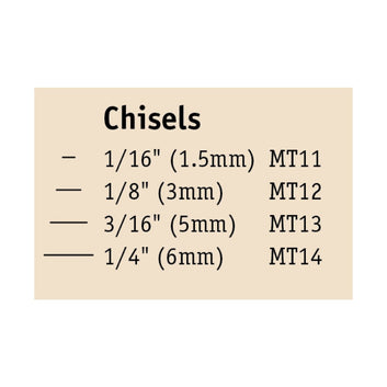 Our Micro Tools can handle the extra-fine details often encountered in woodcarving. This set features four micro chisels. Micro Tools included: MT11 - 1.5mm, MT12 - 3.0mm, MT13 - 5.0mm, MT14 - 6.0mm. Perfect For: Miniature and fine detail work, Cleaning up ridges created by gouge cuts, Cleaning up tight corners, Accessing tight spaces and Carving fine details such as mouths and eyes, plus adding texture such as hair, fur and feathers.
