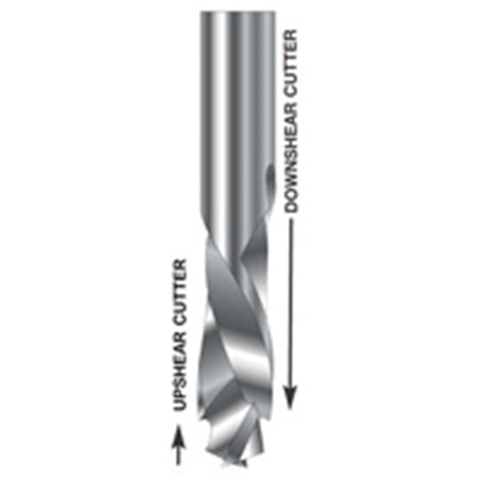 This two flute, solid carbide bit makes clean chip-free and splinter-free cuts in composite sheet goods such as melamine or two sided Formica / Laminates and veneered plywood. The up-shear / down-shear design of the bit cuts toward the centre of the sheet from both sides at once, saving time and eliminating waste. Cutting diameter: 1/2" Cutting length: 1-5/16" Shank: 1/2" Overall length: 3"