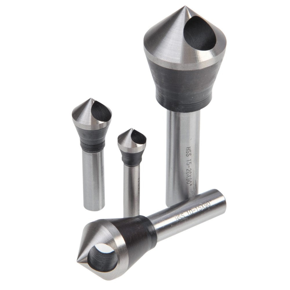 Used primarily in wood and plastic; these countersinks can also be used in soft metals to remove burrs after machining. Each bit has a specific diameter range. Set includes: 2-5; 5-10; 10-15 and 15-20 mm bits in a case. Weight: 545g.