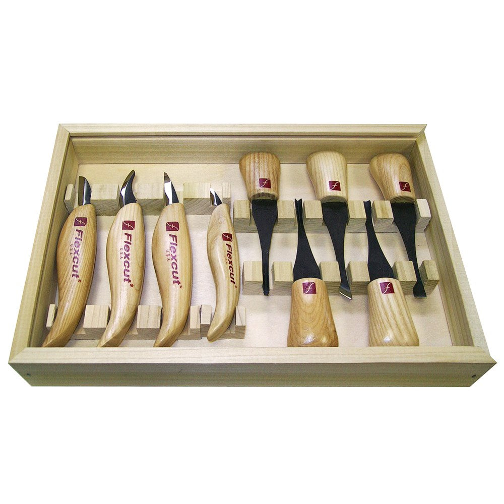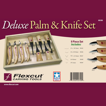 This set includes four razor-sharp carving knives: a cutting knife, pelican knife, detail knife, and mini-detail knife. There are also five palm tools including a skew, V-tool, and three gouges in 1/8" 5/16" and 3/8" sizes.
