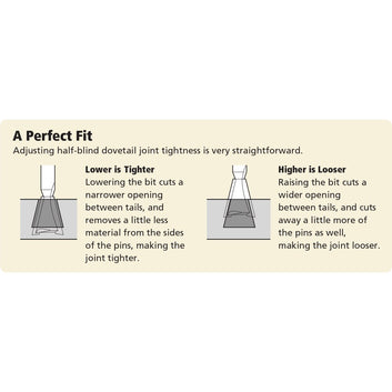 The below information advises the depth of cut for both single pass and variably spaced blind dovetails, and the depth of cut for the router bit. To get a tighter or looser fit, the router bit needs to be adjusted up or down, rather than the jig being adjusted.