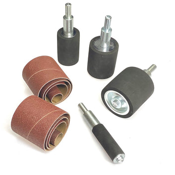 Sanding drums are VERY versatile and give you a great finish. Save the effort of hand sanding, and turn you drill press into a powered spindle sander. Fit the 10 mm shank of these drums into a low speed power drill, drill press or clamp them in the chuck of your wood lathe. The fixed diameter sleeve design means a continuous sanding face with no join and no bump. Easy change grits between 80G and 120G. Supplied with 4 spindles and a full set of 80G and 120G sand paper. Replacement spindles and sleeves available. Includes 1", 2", 2-1/2" and 3" spindles.