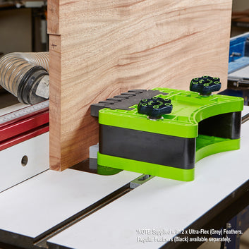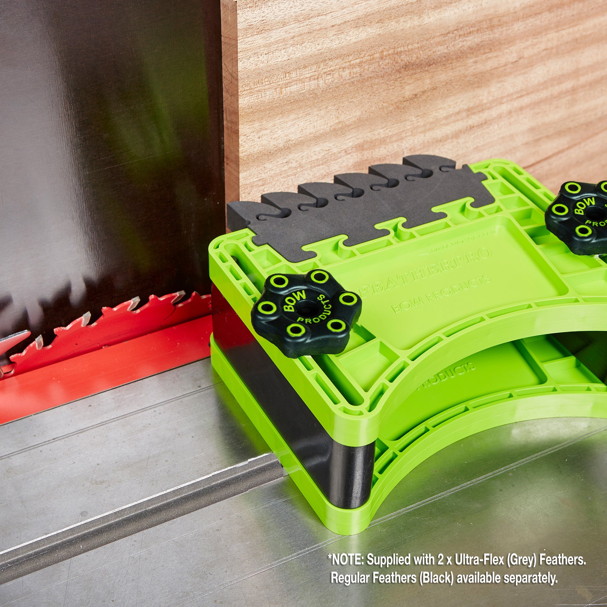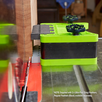 UNMATCHED SAFETY: Patented hinge feather design absorbs kickback and provides 5x greater resistance against kickback versus plastic or wood feathers.REVOLUTIONARY FEED CONTROL: Thicker EVA feathers increase the amount of surface contact on the work piece, ensuring a smoother glide and superior infeed control.VIBRATION DAMPENING: EVA Feathers absorb vibration and minimize chatter for a cleaner cut. Feathers are non-marring and will not harm carbide blades or router bits with accidental contact. VERSATILE - Feathers are reversible, replaceable, and interchangeable. Comes fitted with UltraFlex Feathers. Standard and UltraFlex replacement feathers available. SPECIFICATION - Features AnchorPRO hardware: FeatherDUO mounts to a standard 9.5 x 19mm (3/8”* 3/4”) Miter Slot, or 12-18mm T-Track. Hardware includes two ¾” miter bars that secure in the Miter Slot faster, with less effort and greater hold force. Miter bars have integrated T-Bolts and a greater expansion range that covers variations in slot size. Robust and easy to use oversized ergonomic knobs.
