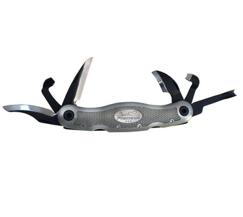 This jack-knife features six blade profiles: Detail Knife, Pelican Knife, Hook Knife (19 mm Radius), Straight Gouge, Gouge Scorp and V-Scorp.