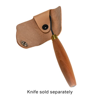 This leather sheath will fit any of the Single or Double Sloyd and Spear Point in our Hook Knives Collection. Wrap around the blade with Snap closure; Fits KN51, KN52, KN53, KN54 and KN55.