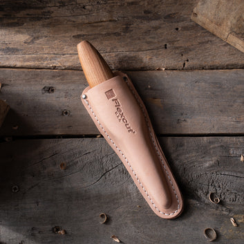 There is no flex in the blade – which makes it sturdy and extremely reliable. The rigidness allows for deep cuts and markings. The blade is thick along its spine and the core is made of high-carbon steel. This results in a very hard edge for superior edge retention. For added strength, the tang of each knife extends completely through the handle. The handle is made of beautifully conditioned cherry hardwood and features a brass ferrule.