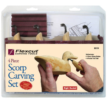 Flexcut's new scorp set gives you a full range of profiles in a single handy tool roll. As a bonus each set includes a specially shaped strop (honing compound not included) to help maintain the edge of these unusually shaped tools. These tools possess the same razor sharpness that all Flexcut's tools are known for.