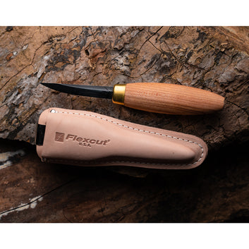 The tang extends all the way through the quality Cherry hardwood handle and is secured with a brass ferrule for strength and beauty. The core of the blade is made of high-carbon steel which gives exceptional sharpness and edge retention.This Flexcut knife also includes a high quality moulded leather sheath featuring a belt clip, keeping the tool (and yourself!) protected while being within easy reach.NB* Regular honing is recommended to maintain the edge. See our range of honing pastes and strops.