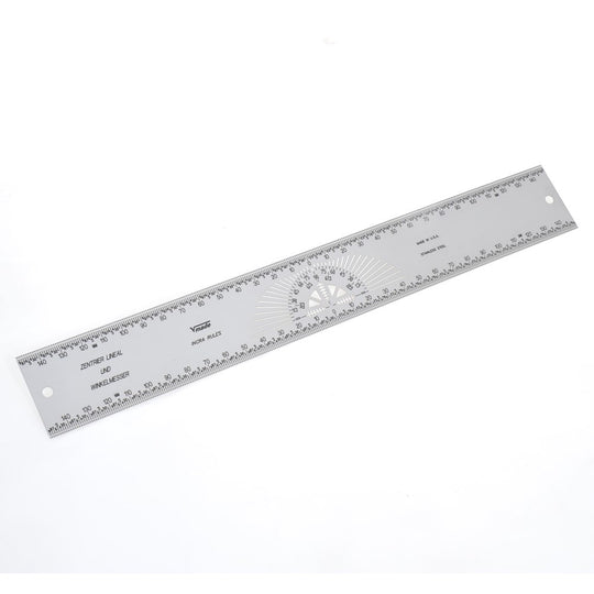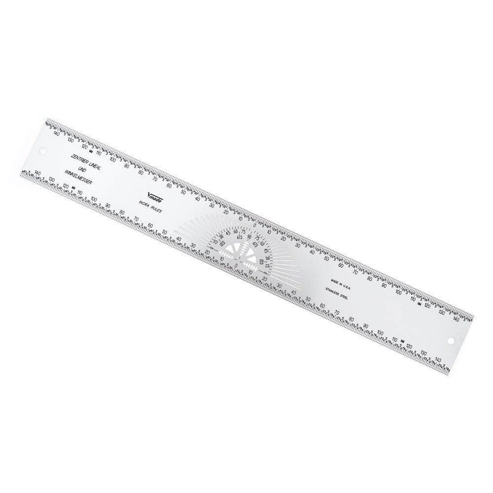 Find the exact centre of any work piece up to 300mm wide. In addition to top and bottom micro-fine marking holes at every 1mm it also has a built-in protractor with guide slots at every 45°, 30°, 22.5° and 5° interval.