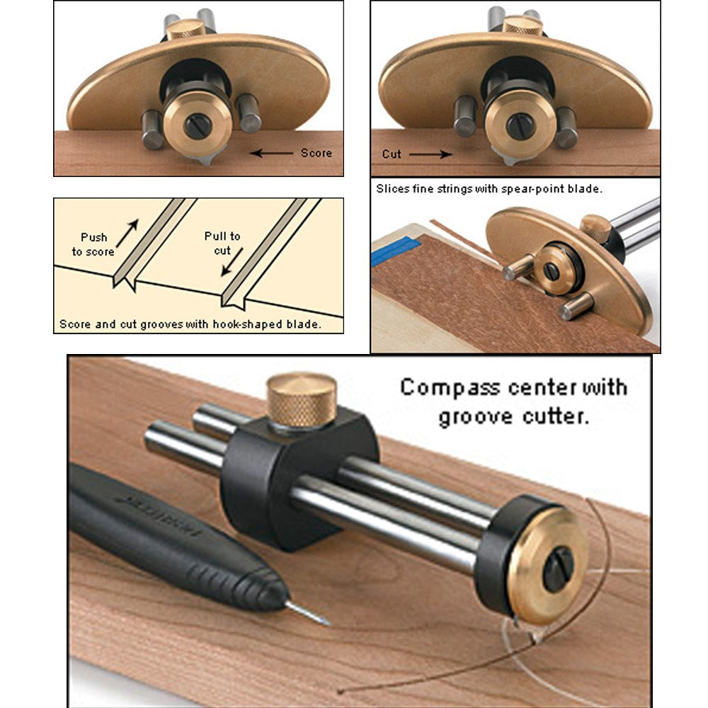 Used like a marking gauge, this inlay tool lets you accurately cut narrow grooves in a workpiece as well as neatly slice fine strings from a sheet of veneer. It has an interchangeable blade system that lets you quickly swap blades to suit the activity.