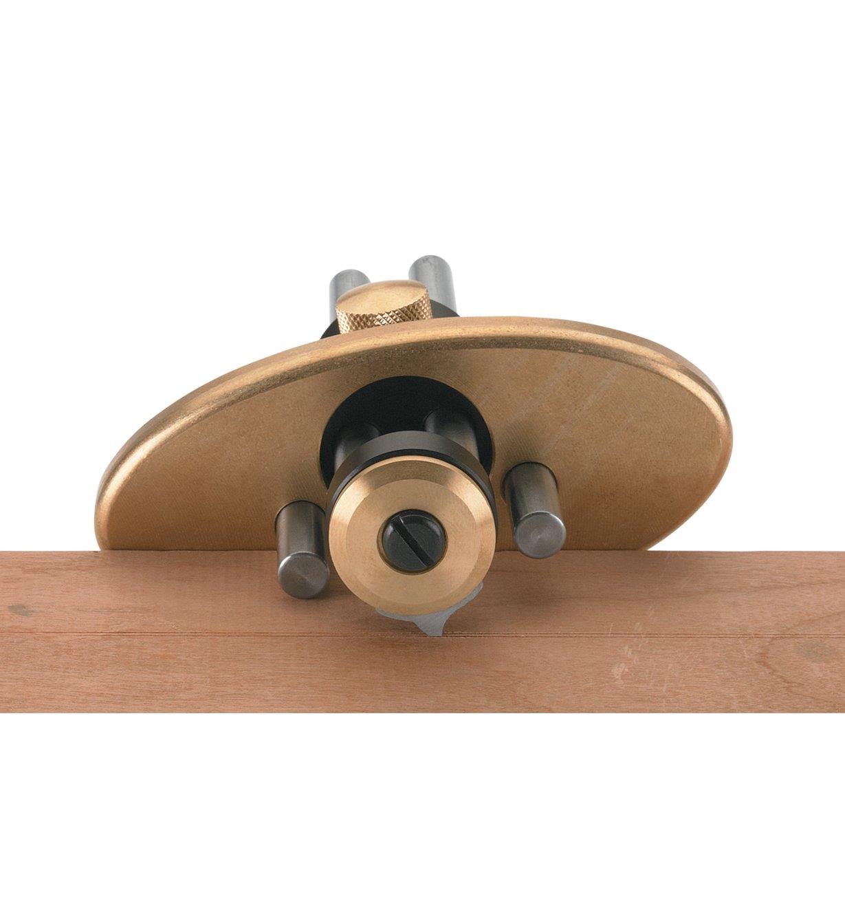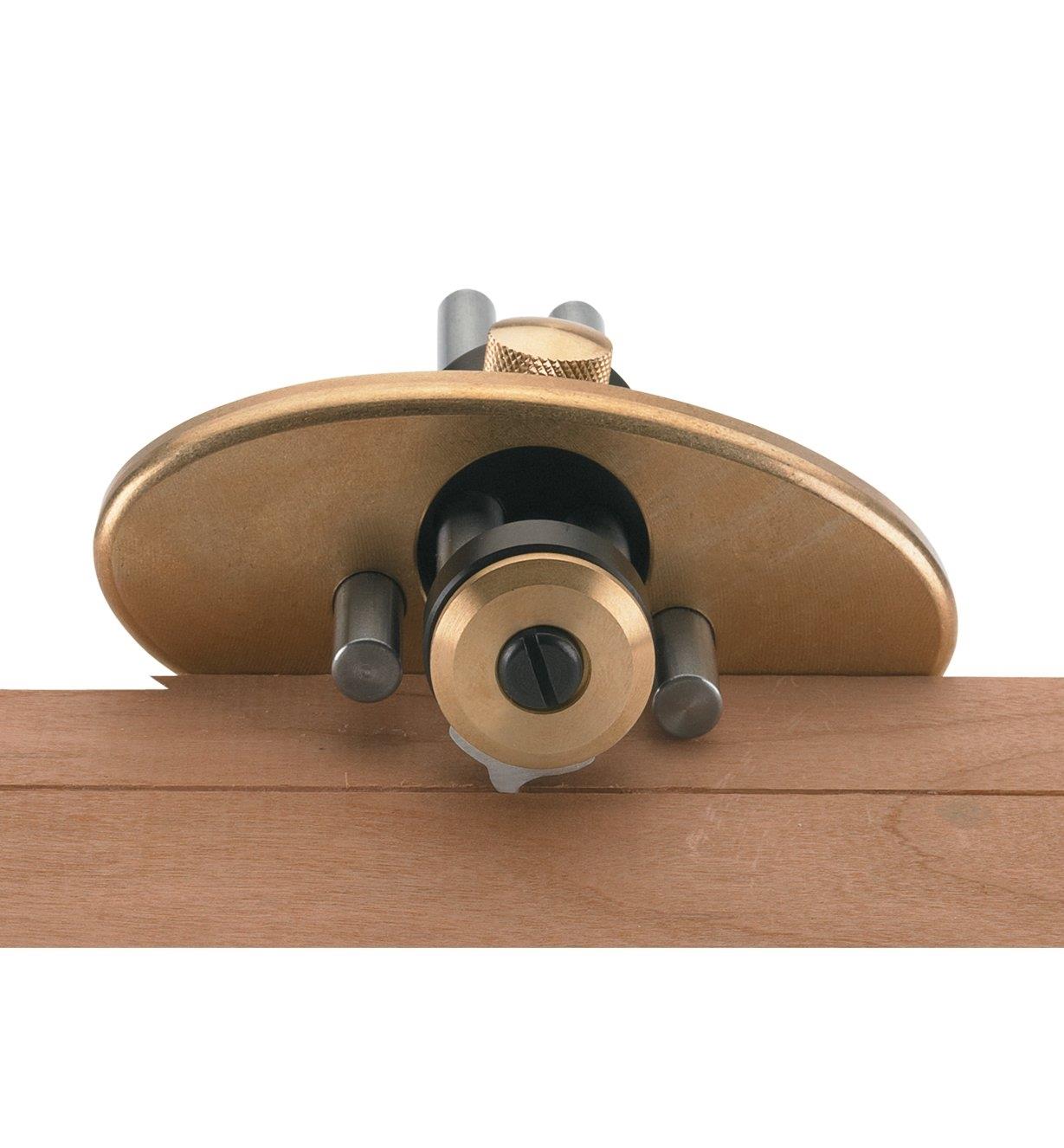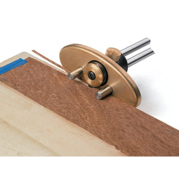 To slice strings of consistent width, the bevel-edged, spear-point blade is used for cutting in either direction. The blades can be offset up to 3-1/4" (82.55mm) from the brass fence (or up to 9-1/4" (235mm) with the optional 10" (254mm) guide rods). Posts projecting from the fence let you pivot the blade into the work when starting a cut, and also serve as limiters to control cut depth (you can remove the posts to attach a custom radiused wooden sub-fence when working with a curved-edge workpiece).
