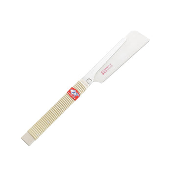 The Japanese Dozuki Pullsaw H-150 has a compact body with the finest blade in our Dozuki backsaw Z series. Ideal for extremely intricate and precise works on general wood materials. The maximum cutting depth of the blade is 38mm. This Fine Dozuki saw features a traditional Rattan wrapped handle that may be held with two hands for a steady cut or for small precise cuts by holding the blade end of the handle with the fore finger resting along the back of the spine. These saws are hardened through the "Hard Impulse" treatment to increase the degree of hardness to the level of HV800-950 which is the maximum hardness that can be achieved on steel. Implementing this treatment on the tips of the saw teeth means that they are able to stay sharp much longer than conventional counterparts while the core of the blade remains both flexible and tough to prevent bending or buckling during use.