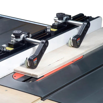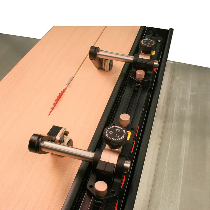 Achieve safer, more accurate cuts on your table saw with the JessEm Clear-Cut Stock Guides. These guides use uniquely angled rollers to steer your timber firmly against the fence, giving you complete control, even with large panels. The one-way roller bearings prevent dangerous kickback, ensuring each roller spins only in the direction of the feed. When you're finished, they conveniently tuck away behind your fence. Built from CNC machined aluminium and durable components, these guides are engineered for excellence and will transform your table saw experience.