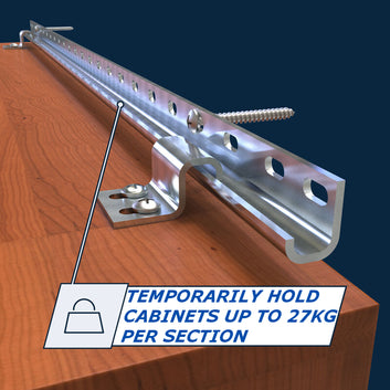 The simple, adjustable cabinet installation system for one-person installation.The 600mm sections of mounting brackets simplify the positioning and installation of wall cabinets by temporarily holding the cabinets in place for you. This system allows you to use brackets to position up to 7.9m of wall cabinets until you can permanently mount them to wall studs. First, mount the steel wall channels to ensure level installation. Next, attach temporary hanging brackets to your cabinets. Then hook the cabinets in place flush against the wall. Adjust and align the cabinets until you've found the exact positioning you want to mount them in permanently, and then you can attach them to the wall studs with ease.