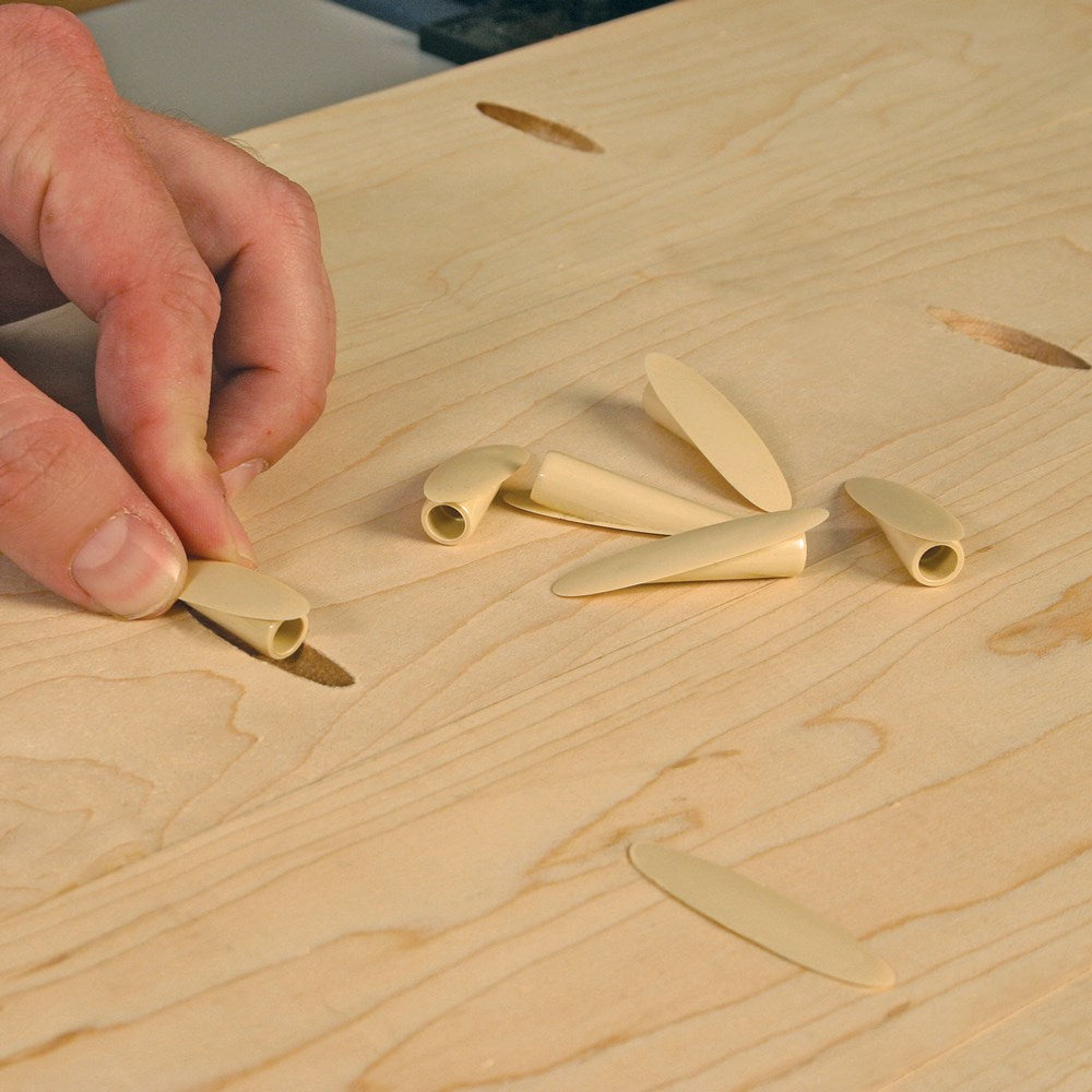 Use plastic pocket hole plugs from Kreg to hide or decoratively accent exposed pocket holes in painted or laminated type surfaces. Simply snap them in, and you are good to go! Five colours available, almond, black, brown, light brown, and white.