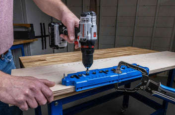 Create perfectly spaced shelf-pin holes with the Kreg Shelf Pin Jig. It has six hardened-steel guides on 32 mm centres and at backspacing that matches the 32 mm cabinet system. A dual-position fence aligns the jig or can be removed to work inside a structure. This jig can also simplify installing concealed hinges and drawer slides in frameless cabinets. Comes with a 5mm brad-point bit.