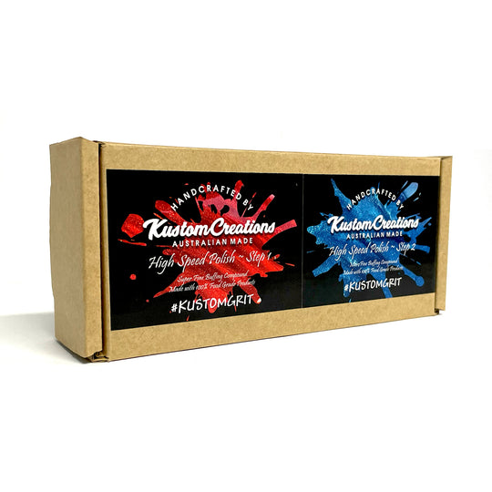 Kustom High Speed Polish is a food grade, low allergenic buffing/ polishing compound for use with any kind of buffing system, that can also be used as a friction polish.Like the Kustom Grit range, it is available in two "steps", rated at #50'000 and #100'000 grit respectively, but unlike the Grit pastes in this case, is formulated into a hard set bar. These smaller bars are 60 grams each and were designed for use as a friction polish for small turning projects or strop compound, as below. Also available in large bars of 200 grams each, which are the most appropriate size for applying to powered buffing wheels/buffing systems.When we say "friction" polish, we mean applied directly to lathe work. Apply by pressing the bar against your piece while running, (or while the machine is off draw on like a crayon), then use a fine cloth to melt and buff the finish while turning! Perfect for acrylic, resin or timber pens and many other projects. Leaves a long lasting and hard wearing high gloss polish.The larger bars represent the best "value" and are perfect for polishing virtually anything you want to polish on a buffing wheel - metals, timber, other hard finishes - anything you would normally use a buffing wheel for.Colour coded labels assist in identifying the correct grit quickly: Red = Step 1; Blue = Step 2 and this is carried across other products in the Kustom Range.TIP - the bar is cast with the Step 1 or 2 into the mould. Using it from the back and opposite end to the number means you will always know which bar to put in which box after use - right up until you need to replace it!