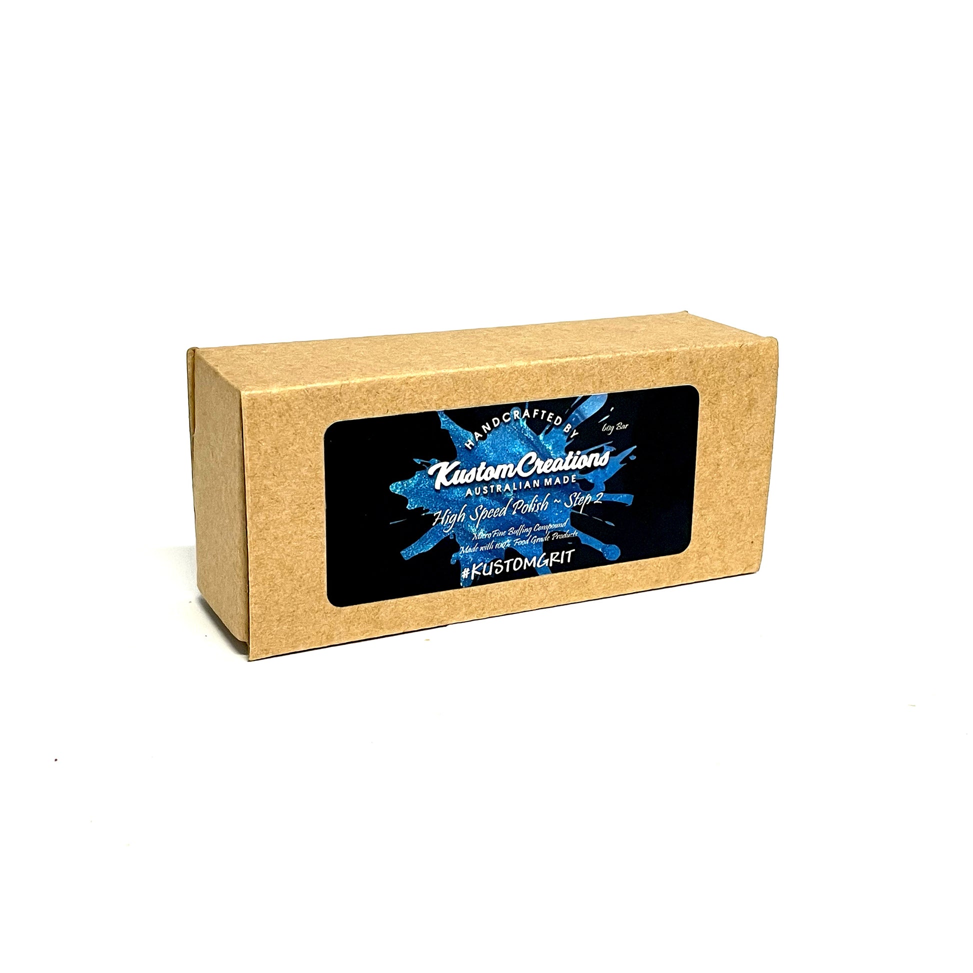 Kustom High Speed Polish is a food grade, low allergenic buffing/ polishing compound for use with any kind of buffing system, that can also be used as a friction polish.Like the Kustom Grit range, it is available in two "steps", rated at #50'000 and #100'000 grit respectively, but unlike the Grit pastes in this case, is formulated into a hard set bar. These smaller bars are 60 grams each and were designed for use as a friction polish for small turning projects or as a strop compound. Also available in large bars of 200 grams each which are the more appropriate size for applying to powered buffing wheels/buffing systems.When we say "friction" polish, we mean applied directly to lathe work. Apply by pressing the bar against your piece while running, (or while the machine is off draw on like a crayon), then use a fine cloth to melt and buff the finish while turning! Perfect for acrylic, resin or timber pens and many other projects. Leaves a long lasting and hard wearing high gloss polish.The larger bars represent the best "value" and are perfect for polishing virtually anything you want to polish on a buffing wheel - metals, timber, other hard finishes - anything you would normally use a buffing wheel for.Colour coded labels assist in identifying the correct grit quickly: Red = Step 1; Blue = Step 2 and this is carried across other products in the Kustom Range.TIP - the bar is cast with the Step 1 or 2 into the mould. Using it from the back and opposite end to the number means you will always know which bar to put in which box after use - right up until you need to replace it!