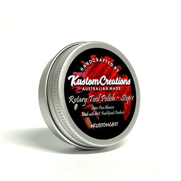 Kustom Rotary Polish is a food grade, low allergenic buffing/ polishing compound, specifically formulated for Rotary Tools.These are the ultimate polishes for Jewellers, Netsuke masters or anywhere small detailed pieces need to be polished! Formulated with a hard set making it stable at high speeds, use these polishes with the various shaped buffing heads available for Dremel® Tools, Archer Power Grinders, Foredom® Tools and similar detail powered rotary tools. Can be used on metals, timbers, plastics, resins and more. Leaves a long lasting and hard wearing high gloss polish.Like the Kustom Grit range, it is available in two "steps", rated at #50'000 and #100'000 grit respectively. Colour coded labels assist in identifying the correct grit quickly: Red = Step 1; Blue = Step 2 and this is carried across other products in the Kustom Range.