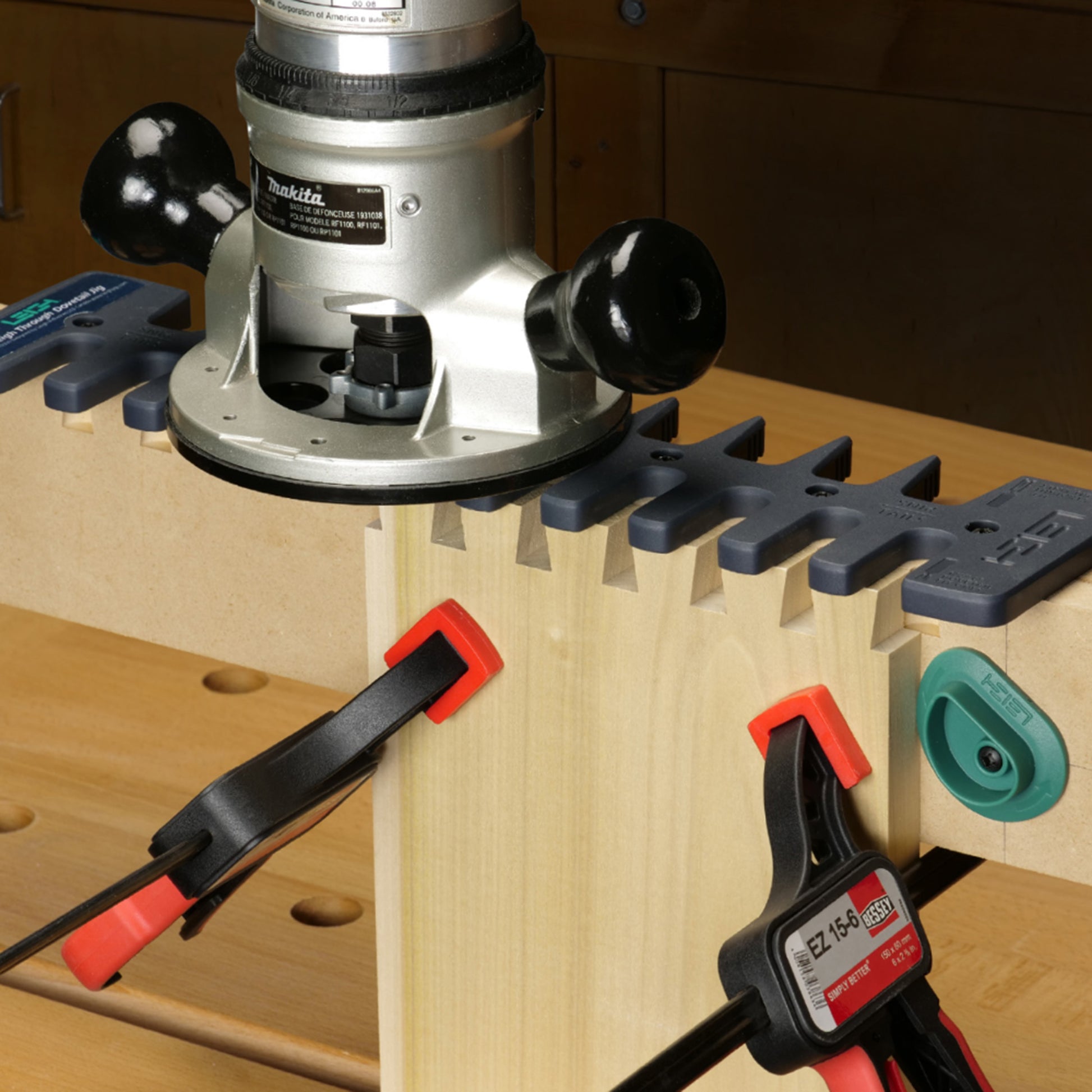 Can be used with hand-held router, or on your router table!Make joints in boards from 32mm (1-1/4") up to 327mm (12-7/8") wideBoards up to 20.6mm (13/16") in thicknessSold as a complete kit including -30% Glass filled Nylon Through Dovetail Template1/2" Shank Straight and Dovetail Router BitsE-Bush Guide with "Tuning Fork"Adjustable Side StopsComprehensive instruction manualCheck the description for more information!NB - the MDF spoilboard shown in some images is not included