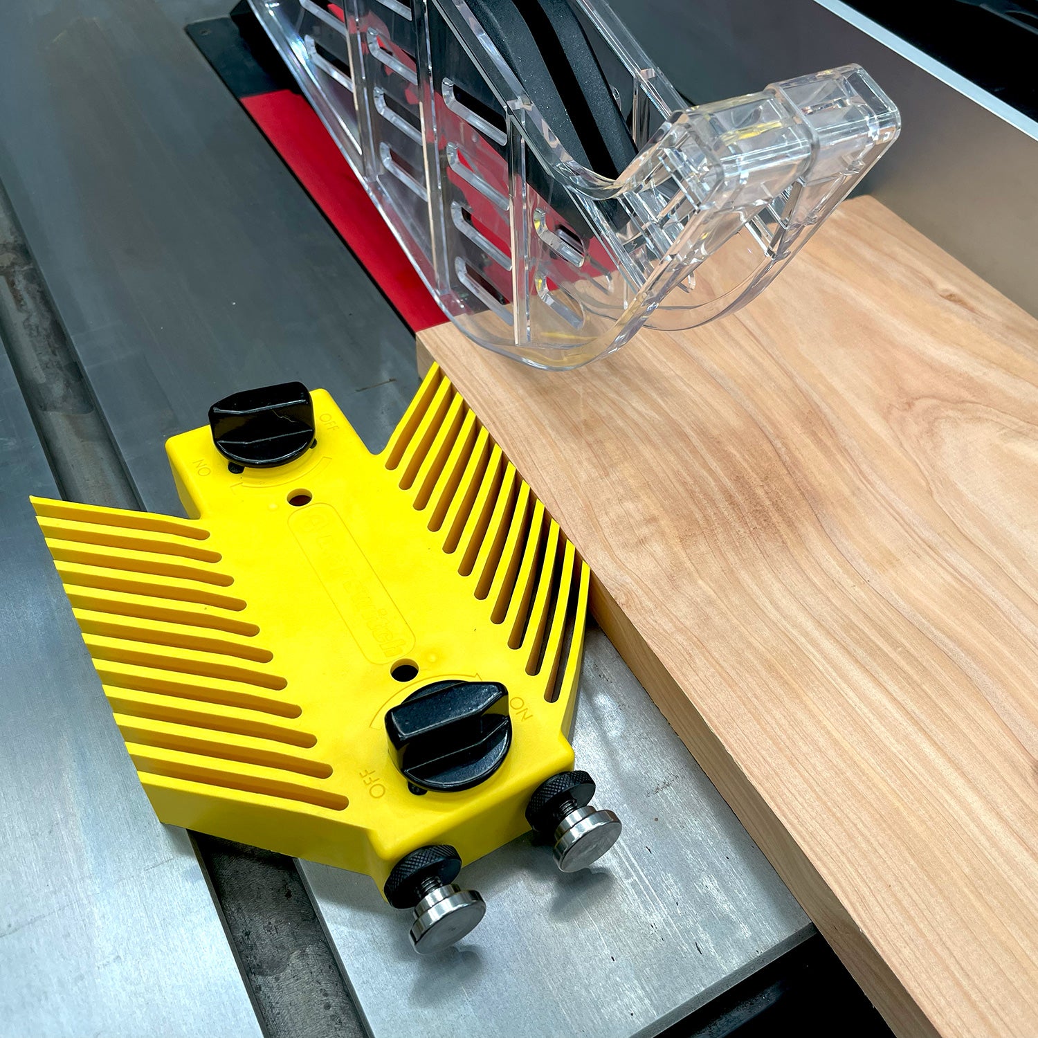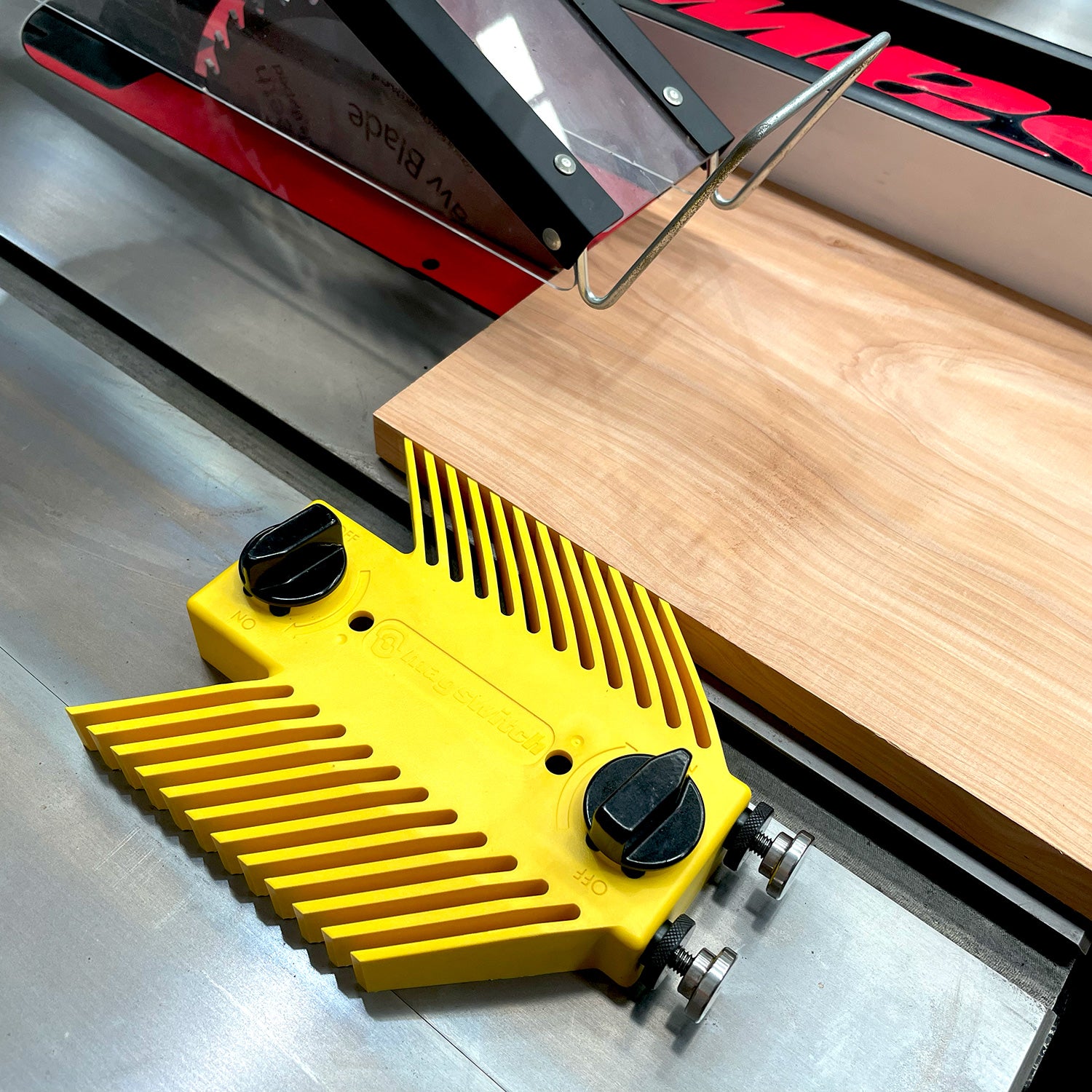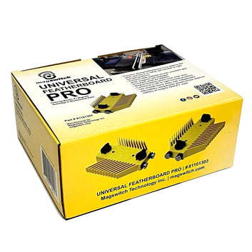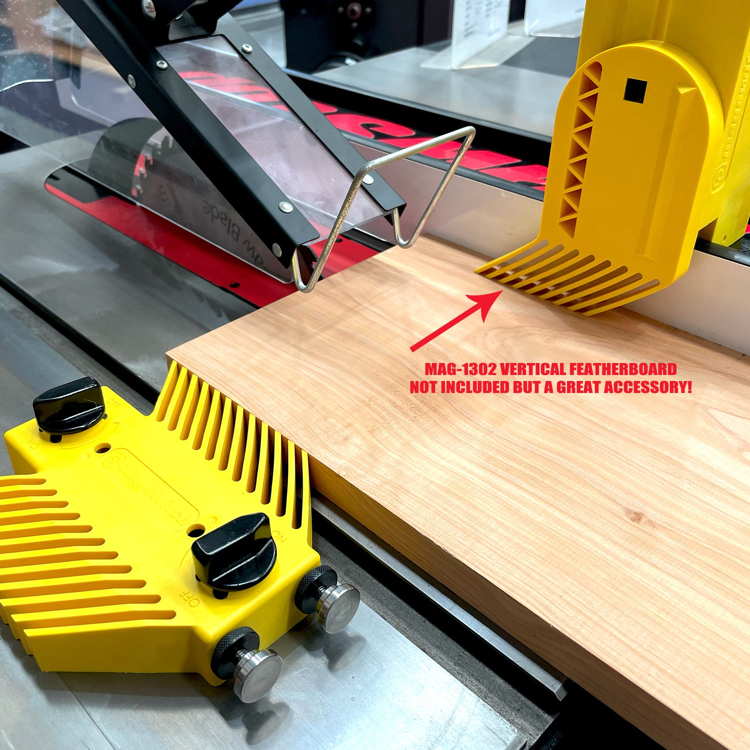 The all NEW Magswitch Universal Featherboard Pro provides strong featherboard force against the table saw fence in either left handed or right handed positions. Wide base magnets and gaskets provide excellent grip even when placed over the table saw miter slot. Additionally two micro adjustable bump feet allow the tool to function as a versatile stop for cross cuts and slots.