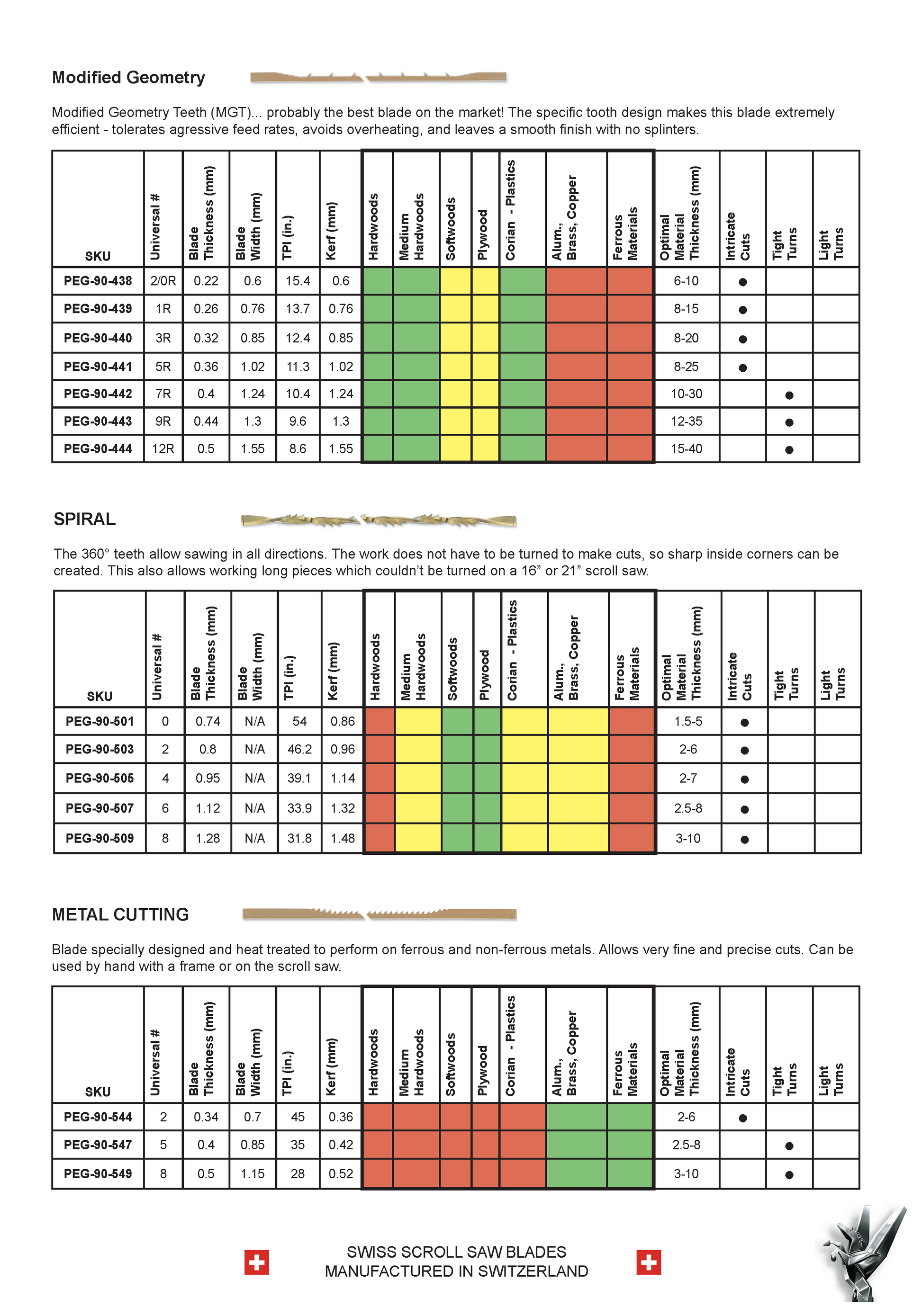 Pgas blades are manufactured in Vallorbe, Switzerland from the best available carbon steels. The teeth are perfectly and equally set (right and left), enabling straight cuts without having to compensate for deviation. They are heat treated after machining, which is the only method that guarantees both toughness and optimum flexibility.With a large range available, we believe they are the unequaled in quality and represent the best blades on the market. Routinely outperforming and outlasting the competition in independant testing and all at exceptional price points! Professionals and hobbyists alike will appreciate what Pgas blades offer you.Make your scroll saw really perform with Pgas blades.