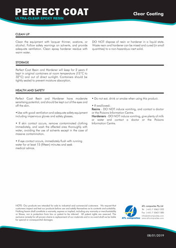 Perfect Coat is a solvent free, liquid epoxy resin specifically designed as a crystal clear, high-gloss coating system for timber coating that will self-level, and cure at room temperature.Kit contains 2 litres of Resin and 2 litres of HardenerMixing resins by weight is a lot more accurate than by trying to mix it by volume. This is done using digital scales; place a clean mixing container onto the scales and zero it. Pour in the required amount of part 1, take the weight and multiply by 0.88. Zero the scales and pour in part 2 COATING 1:1 by volume / 1:0.88 by weight