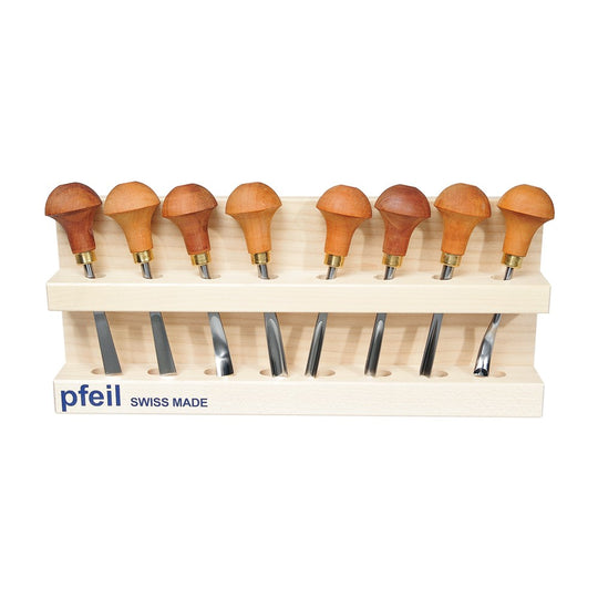 A great eight piece set that is great for carving small projects or for beginner's work. Set includes the following Pfeil palm chisels with pear shaped handles: B 2-12; B 4-12; B 7L-12; B 8-10; B 9-7; B 11-7; B 15-6; B 25/10