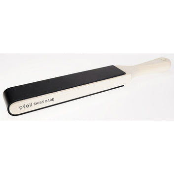 Premium fine calf leather mounted on a wooden block. Used with polishing creams for the finest razor sharp knives; chisels; etc. Approximate overall length 150mm.