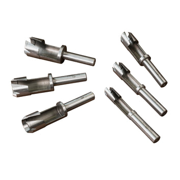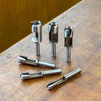 For cutting plugs to fill holes or covering screws or bolts, these plug cutters give provide a good finish to the plug. Ideally, they cut the plugs from a board, leaving them apart of the board. Then the timber is then cut into two using a tablesaw or bandsaw, allowing the plugs to fall out. Prying them from the board or out of the cutter can damage them. Cuts plugs up to 50 mm in length. Set includes the following sizes: 3/8"1/2"5/8"3/4"7/8"1" Note: due to there being no centre guiding drill bit, these cutters need to be used in a drill press.