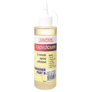 Rapid Cure R90 PART B - 5 Minutes Cure Time. Rapid Cure R90 is a high viscosity; solvent free epoxy resin specifically formulated for use with H90 hardener to provide thin film or glue joint gelation in approximately four minutes at 25 degrees C. This type of adhesive is used in marine joinery and repair; commercial joinery; furniture manufacture; stone and masonary bonding and home handyman applications. Rapid cure will successfully bond to softwoods;; hardwoods; particle board; MDF; Formica; glass; leather; ceramics; most metals including stainless steel; and some plastics. Small laminations with fibreglass cloths are also possible. Mix Ratio: 1 part hardener (RAPID-HARD250) to one part resin (RAPID-RES250) by volume.
