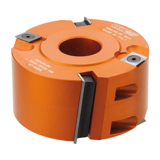 Cutter head is made of high tensile strength aluminium alloy. Features tungsten carbide double-sided replaceable knives.Also features scribing cutters at each end of the block. Cutterhead diameter: 100mm; blade width: 50mm. Available in 30mm or 35mm bore. Replacement blades and wedges are sold individually.
