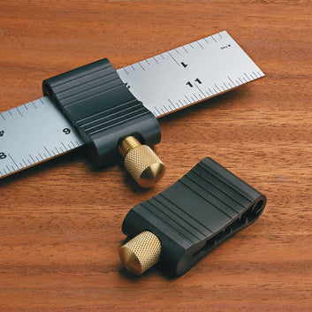 The Veritas ruler stop increases the usefulness of a metal ruler by providing a solid reference point. It is ideal for setting saw fences, repeat cuts, etc.