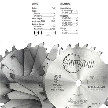 Get unmatched performance from SawStop's all-new Dado Set!This premium specialized blade set is ideally suited for cutting and channeling both soft and hardwoods. It provides exceptional cutting performance and offers a variety of chipper widths to give maximum flexibility and precision.The flat grind 4 tooth chippers in a variety of thicknesses along with shims, offer easy customisation and a wide range of channel widths from 1/4" to 29/32" (6.35mm to 23mm). The outer left and right 24 tooth blades provide clean corners for easy glue-ups right off the saw.SawStop machine compatible, this Dado stack is ready for any project!NB* Requires use of SawStop's Dado Brake Cartridge and appropriate table insert.