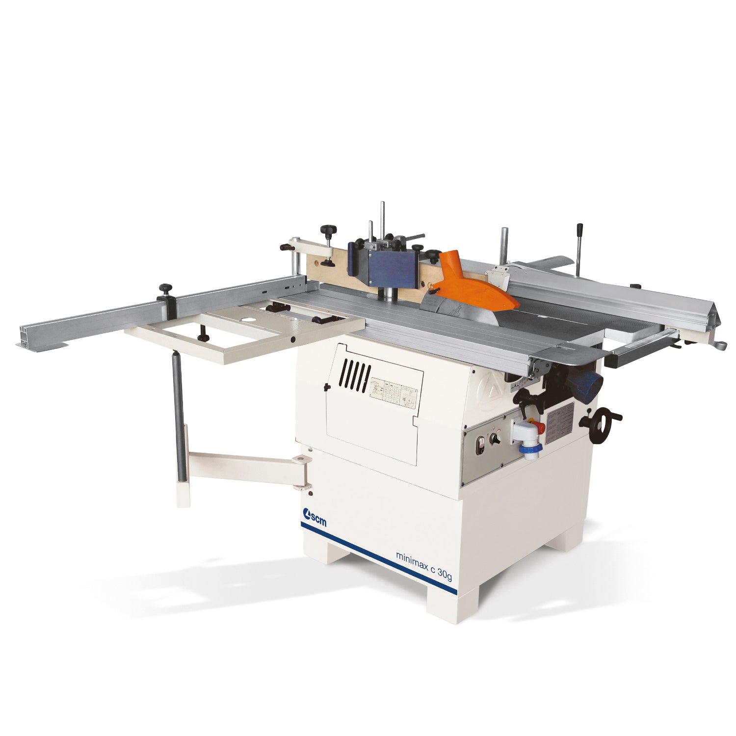 Cutting precision Tilting saw unit with a 250 mm blade and a maximum blade projection from table at 90° of 80 mm. The saw unit can be raised and tilted using convenient hand-wheels. The anodized aluminum sliding table, with a 1200 mm stroke, slides next to the blade, ensuring cutting precision. (C30G ONLY: Fitted with rail supported squaring frame and long crosscut fence)Flexibility Maximum flexibility in spindle moulder tool use, with the unit with 2 speed (5000/7500 rpm). The machines have a spindle moulder fence with micrometric adjustment, a feature which is particularly useful on profiling jobs. Tenoning is easy too, thanks to the aluminum sliding table, the right speed setting and the special protection hood (option). Practical and ergonomicTo keep the machine compact and make machining easier, the cast jointer table opens towards the inside of the machine. Thanks to an efficient feed system, the thicknessing unit can process wood up to 300mm wide and 200 mm thick. Featuring SCM's "Xylent", Spiral cutterhead, for perfect machining with reduced noise.Safety as standardGenius machines have a rich array of european safety available fitted as standard, such as the spindle protection to carry out machining on curved and shaped profiles.