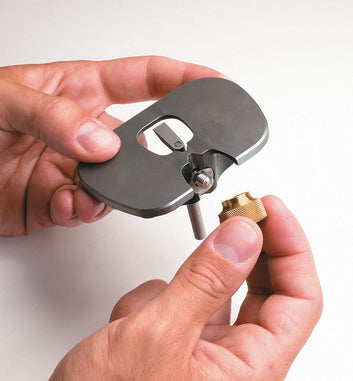 The blade may be positioned inboard for standard closed-throat use, or outboard, with the blade extending past the body, for true bullnose work. Positioned behind the blade, the blade-clamping knob allows visibility and chip clearance. The comfortable, accurately machined ductile cast iron body has a lapped sole. The 7 oz plane is 3 1/4" wide by 2 1/4" deep, with a 1/4" wide high-carbon steel blade. Patented.
